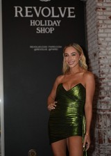 Influencer, podcaster and Olivia Culpo’s older sister Aurora Culpo showing big boob cleavage in a green and sparkly dress while attending the Revolve Holiday Shop in Los Angeles!