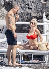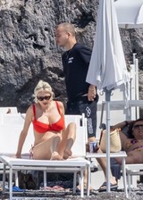 Bikini candids of a pregnant Caroline Vreeland at the beach in Positano, Italy! I can’t tell if her already massive tits has grown already, but its mind blowing to imagine what they are going to be like a few months from now. I hope her husband enjoys them! Or, I will!