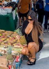 Here’s busty Italian-American model Claudia Romani wearing a tight lil’ black dress while posing next to some wicked statues and fruit at a farmer’s market in Miami! I like the statues and she’s got some nice fruit there too. Pineapple, coconut and of course.. MELONS!