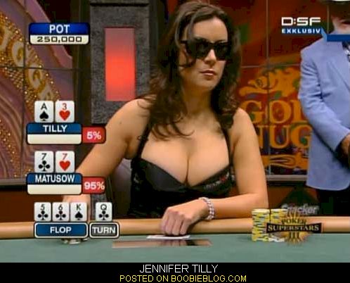 Yeah, I know.. whats with all the Jennifer Tilly posts lately? It seems her boobs have been everywhere as of late and here they are at a poker table. I can imagine she cleaned up considering everyone else was probably too busy staring at her chest.