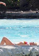 Candids of Jessica Simpson on her back in a bikini while catching some rays at the beach in French Polynesia! Not the best view of her big boobs, but I really enjoy the idea of a half naked Jessica on her back, and those last three shots show you the epic scale of her chest. Drake could probably make a whole album about the VIEWS you would get while banging her on her back. DAYUM!
