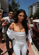 Kim Kardashian is in Miami and she strapped her big tits into this white outfit while out doing… whatever it is she does! I really enjoy those two down blouse shots but goddamn I would be annoyed if I had her life and crowds of people followed me everywhere. I’d be punching!