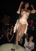 Here’s busty actress Meagan Good performing on stage at the Pussycat Dolls Burlesque Saloon in Las Vegas! That burlesque outfit is a good look for her and I like the window cleavage on that dress for her arrival.