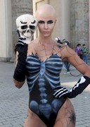 Micaela Schaefer got into the Halloween spirit by dressing up as a “sexy” skeleton in Berlin! I like the body paint work but going bald is NEVER a good idea. I like the skeleton dog though.