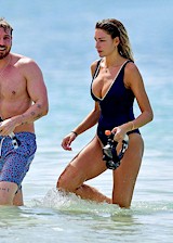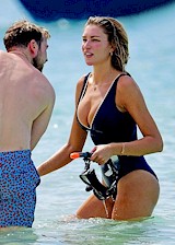 Candids of Zara McDermott wearing a DEEP CLEAVAGE swimsuit at the beach in Barbados! Must be nice to have such big floatation devices when you’re out there snorkeling and looking at fish. No wonder she doesn’t need to wear a life jacket.
